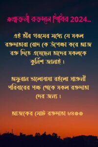 আমরা জানি এতে ব্লাড ব্যাংকের রক্তের হাহাকার মিটবে না ,তবু আমরা এই ভয়ঙ্কর সমস্যার মুখোমুখি দাঁড়িয়ে লড়াইয়ের একটা মানসিকতা রাখতে চেয়েছি সকলের সামনে , দায় নিতে চেয়েছি নিজেদের কাঁধেও । আমাদের অনুরোধ রইল প্রতিটি সংগঠন, ক্লাব ও প্রতিষ্ঠানগুলির কাছে যারা প্রতিবছর রক্তদান শিবির আয়োজন করেন মুমূর্ষ রোগীদের কথা মাথায় রেখে দয়া করে বিশেষ কোন দিনক্ষণ , নাড়ি নক্ষত্র , দেখে রক্তদান শিবির করার প্রথা ভেঙে বেরিয়ে আসুন। ১৫ ই আগস্ট স্বাধীনতা দিবসের দিন চারপাশে প্রচুর ক্যাম্প হবে, কিন্তু তার এক মাস আগে থেকে ক্যাম্প করার প্রবণতা বন্ধ হয়ে যায় । আমাদের বিভিন্ন উৎসব ,পুজো পার্বণ এর মাসে রক্তদান শিবির করা বন্ধ থাকে। সেই সময় চারিদিকে রক্তের হাহাকার চলে । তখন এগিয়ে এসে ক্যাম্প গুলি আয়োজন করুন তাতে আমার-আপনার , মুমূর্ষ রোগীদের এবং সমাজের কল্যাণ হবে ।।